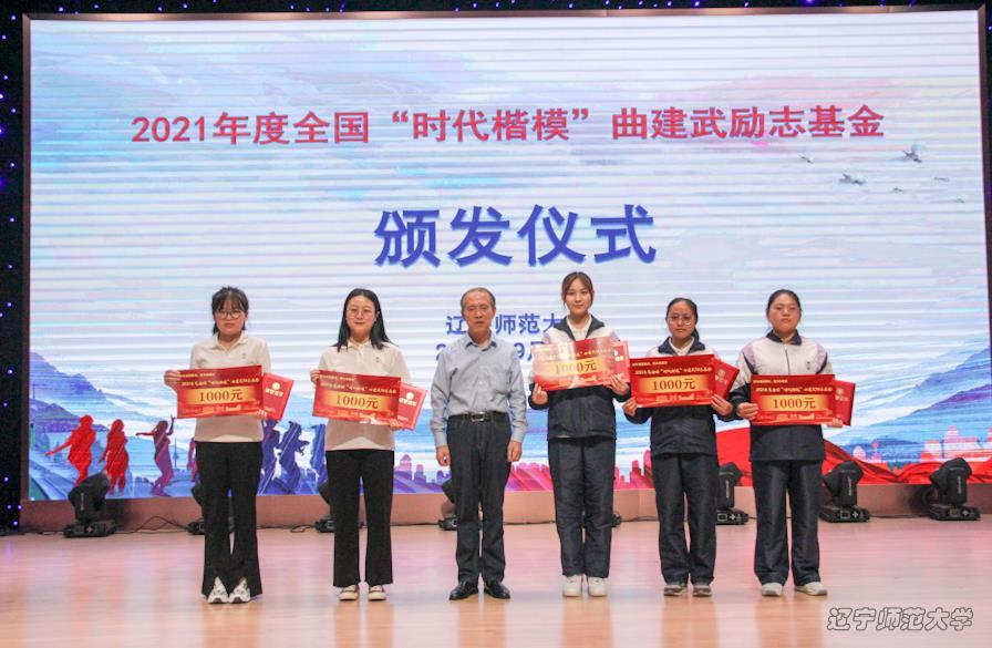 报告会前,曲建武教授为海洋之神8590优惠大厅娜迪拉·阿不都米吉提等5名同学颁发了全国“时代楷模”曲建武励志基金。