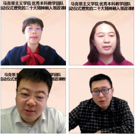 我院获批的学校优秀本科教学团队和教学组织代表思想政治教育系主任伊娜、“毛泽东思想和中国特色社会主义理论体系概论”课程教研室主任姜永建、“马克思主义基本原理”课程教研室主任王晓翔、“中国近现代史纲要”课程教研室主任徐绯璐老师分别围绕党的二十大精神融入思想政治教育专业建设、融入思政课教学等问题做了主题发言。